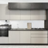 Cucina Amira in composizione fissa da 270 cm con 4 elettrodomestici Master Kitchen((lavastoviglie, piano cottura gas 60cm 4 fuochi e forno elettrico statico)) senza frigo. Non essendo presente il frigorifero, la mano (dx/sx) è data dalla posizione del lavello.Athena risponde alla richiesta di cucine senza frigo, o con frigorifero freestanding abbinato, con una composizione piacevole e con grande capacità di contenimento.