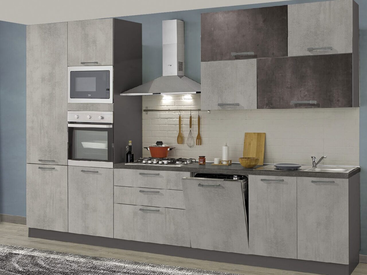 CUCINA KIRA CM.360, CEMENTO FUMO/ARDESIA CAPPA NERA – CON 5 ELETTRODOMESTICI