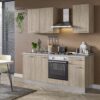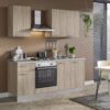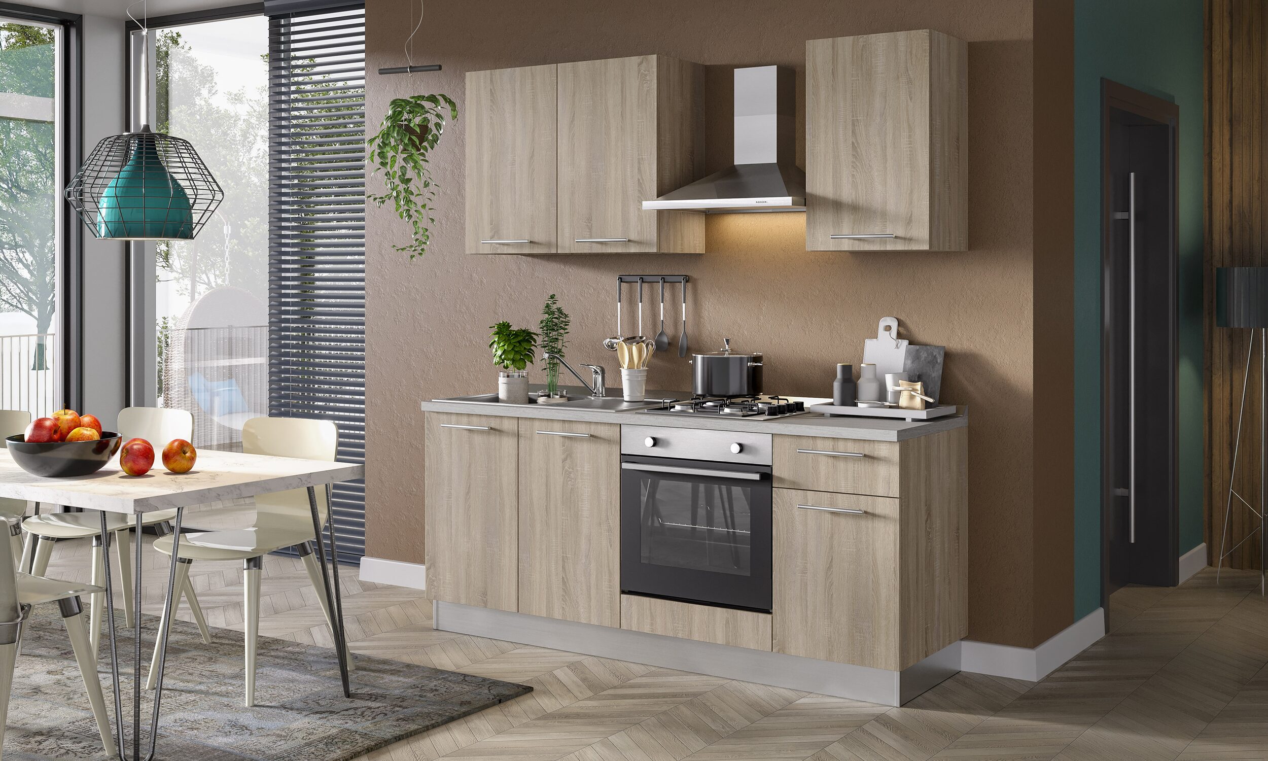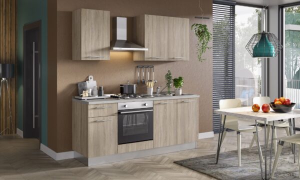La cucina monoblocco MILA da 195 cm è la soluzione ideale per chi cerca funzionalità e stile naturale in uno spazio compatto. Caratterizzata da una calda finitura in nobilitato rovere sonoma e moderne maniglie a tubetto color inox, questa composizione fissa (destra o sinistra) include un piano cottura a quattro fuochi, forno elettrico statico nero, cappa aspirante e lavello con gocciolatoio, offrendo tutto il necessario per la tua casa in meno di due metri di larghezza.