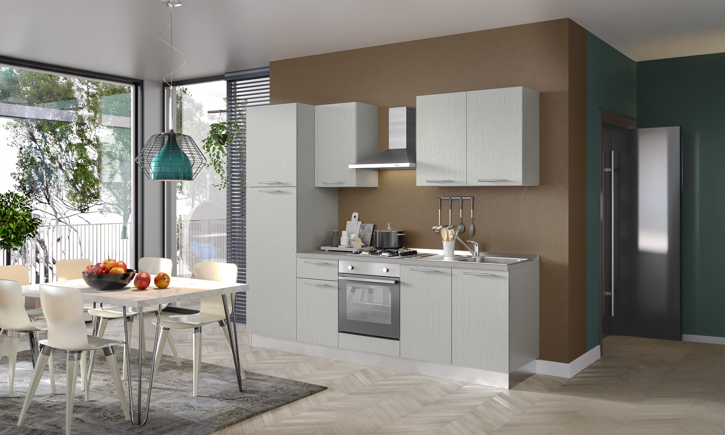 Cucina in composizione fissa 255cm con frigorifero a destra o sinistra.