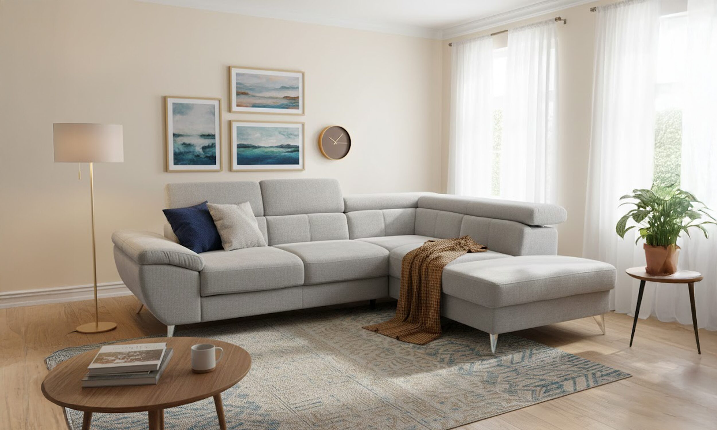 Divano angolare 3+2 posti con contenitore e funzione letto estraibile. Poggiatesta reclinabili.