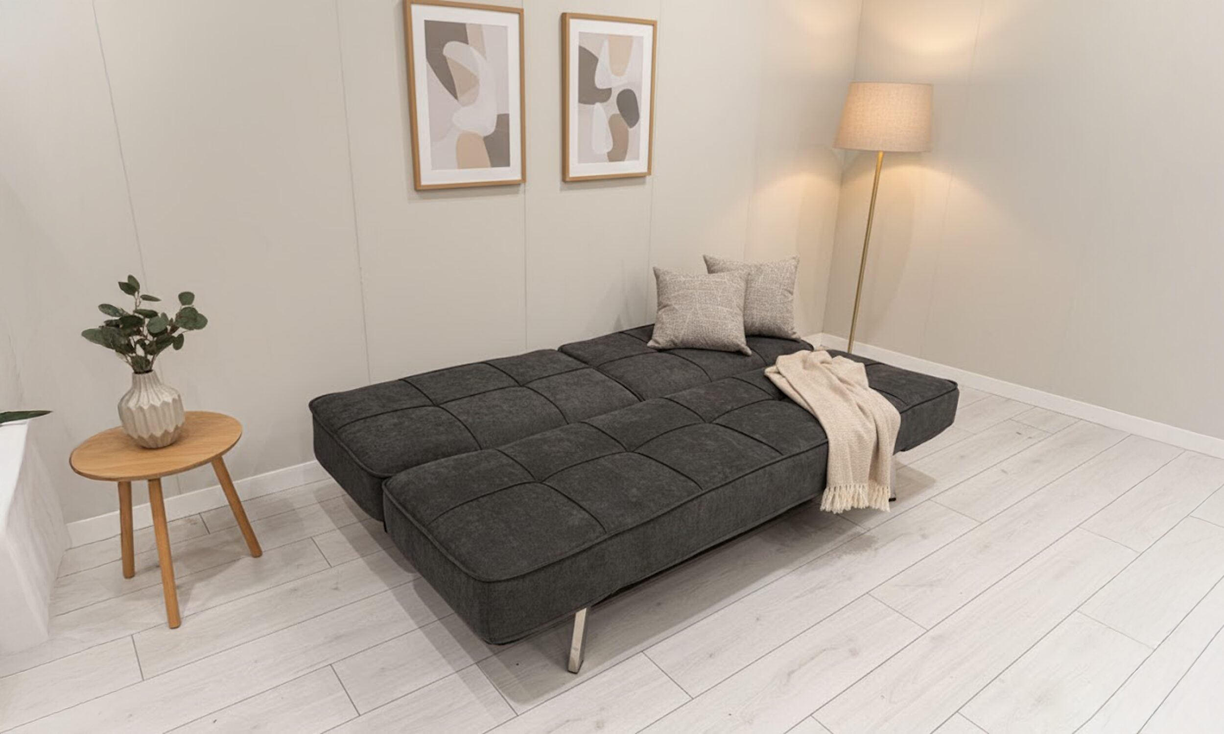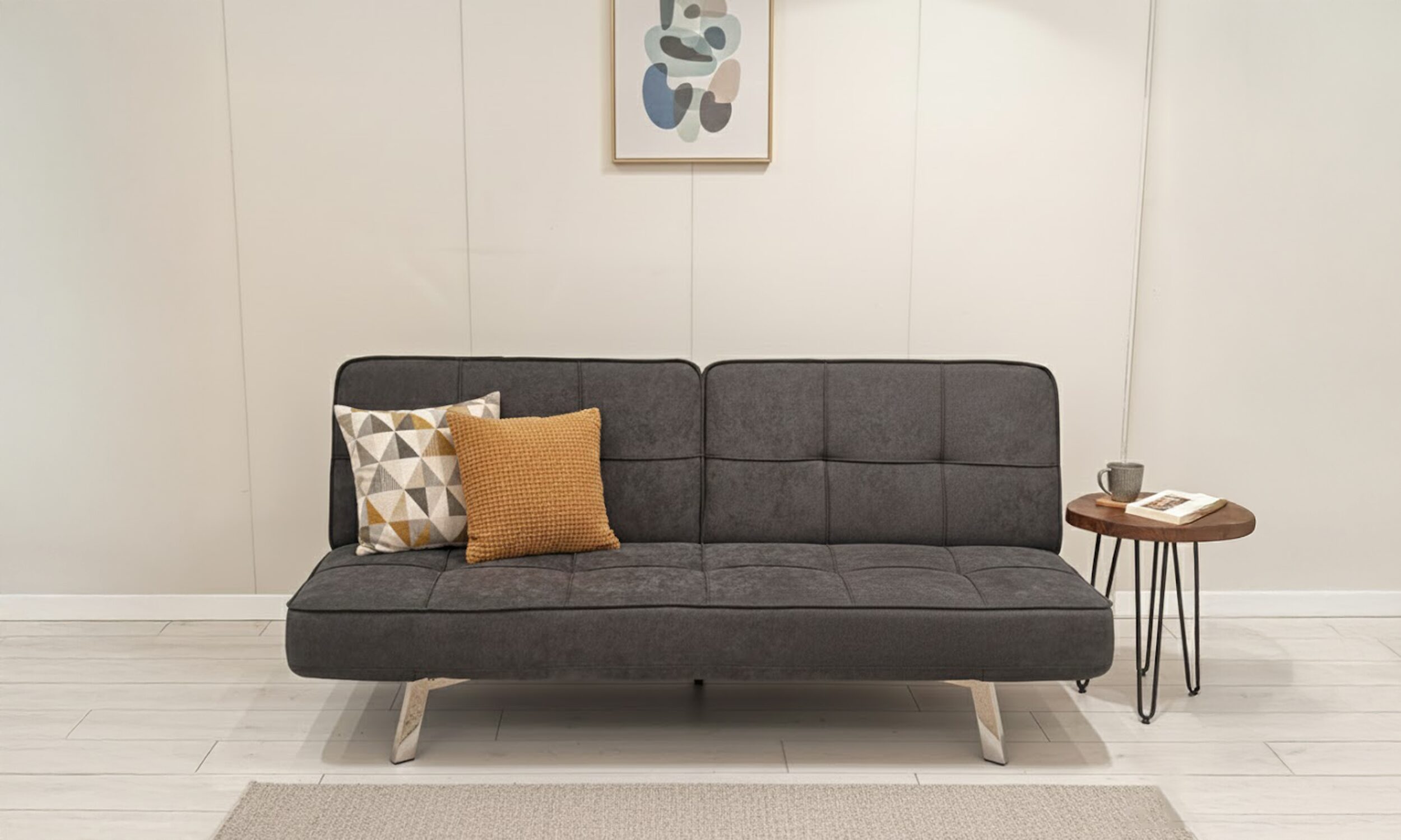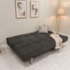 Divano letto rivestito in tessuto grigio.
