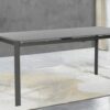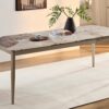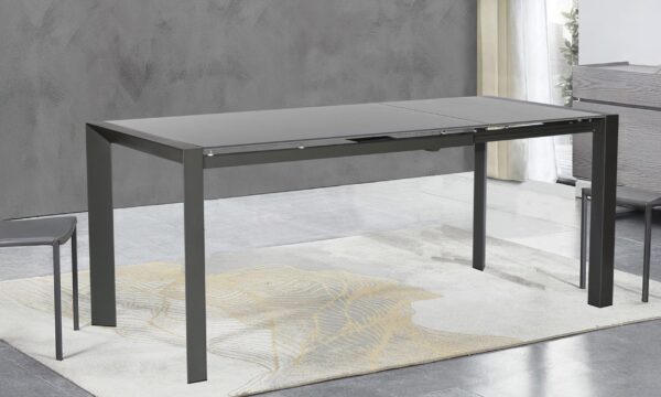Tavolo rettangolare con piano in vetro grigio o bianco.