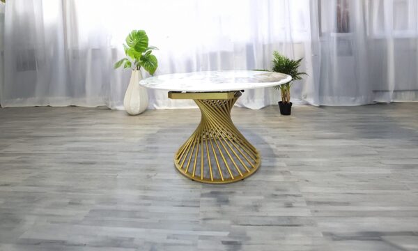 Tavolo Karma, trasformabile e dal design sorprendente, caratterizzato da un innovativo meccanismo di rotazione che permette al piano di aprirsi e diventare un elegante tavolo rotondo di diametro 135 cm. Il piano in pietra sinterizzata effetto marmo bianco lucido  conferisce luminosità e raffinatezza, mentre il basamento in metallo a stecche “Vortice” verniciato in colore grigio o oro, dona dinamismo e personalità all’intera struttura.