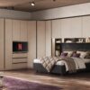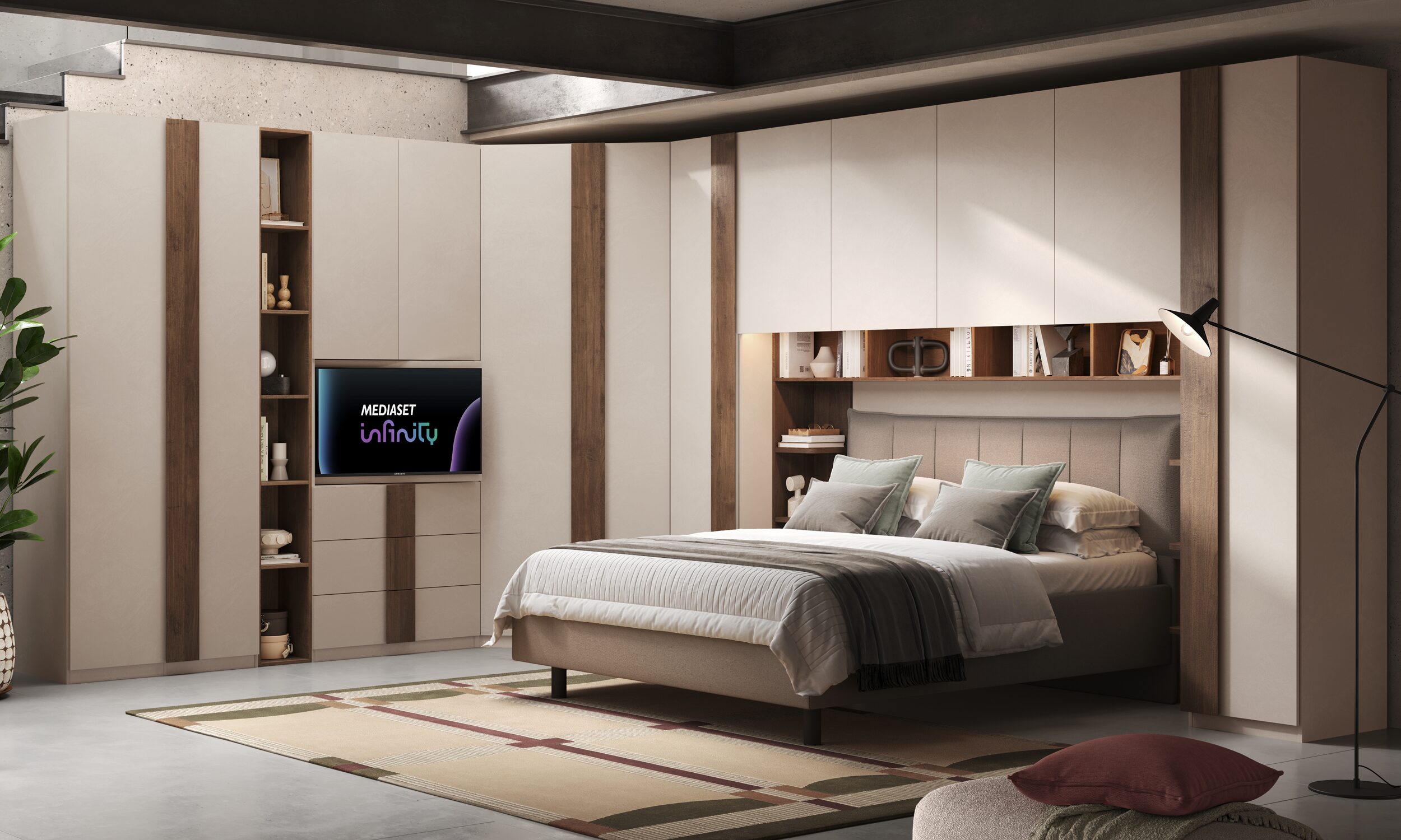 Armadio modulare ad ante battenti con finiture effetto legno e superfici opache. La combinazione di tonalità calde e linee pulite crea un ambiente accogliente e contemporaneo. Disponibile da 1 a 6 ante, personalizzabile con diverse soluzioni interne.