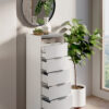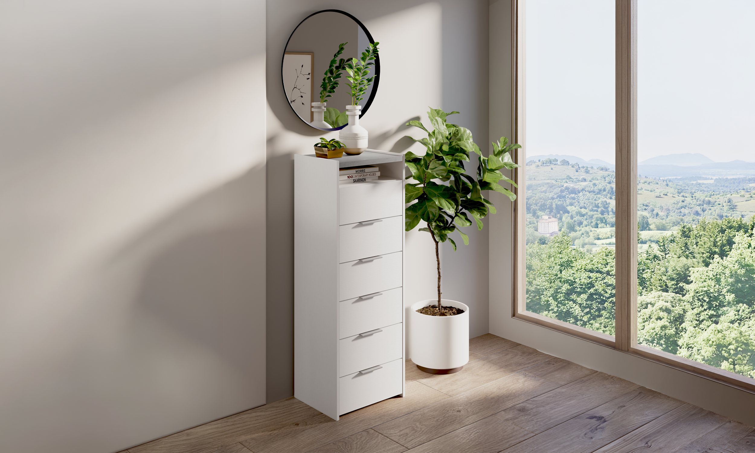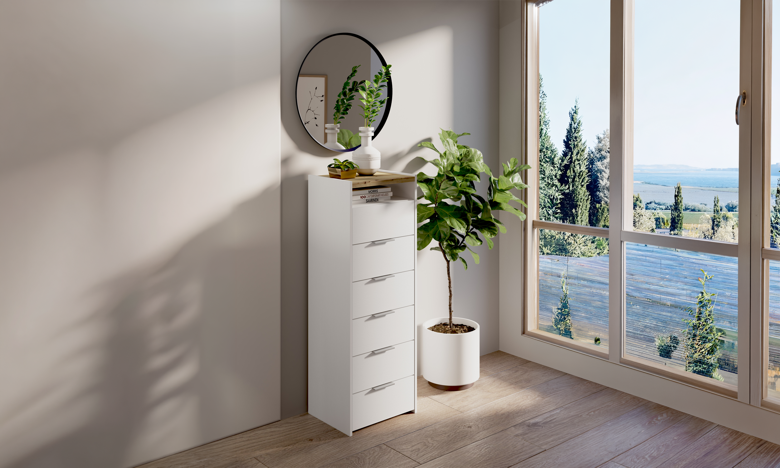 Il settimanale TOX combina estetica moderna e massima funzionalità: dotato di 6 cassetti e vano giorno, è proposto nella raffinata finitura bianco frassino con top in cemento beton. Un complemento ideale per aggiungere stile e capienza alla tua camera da letto.