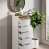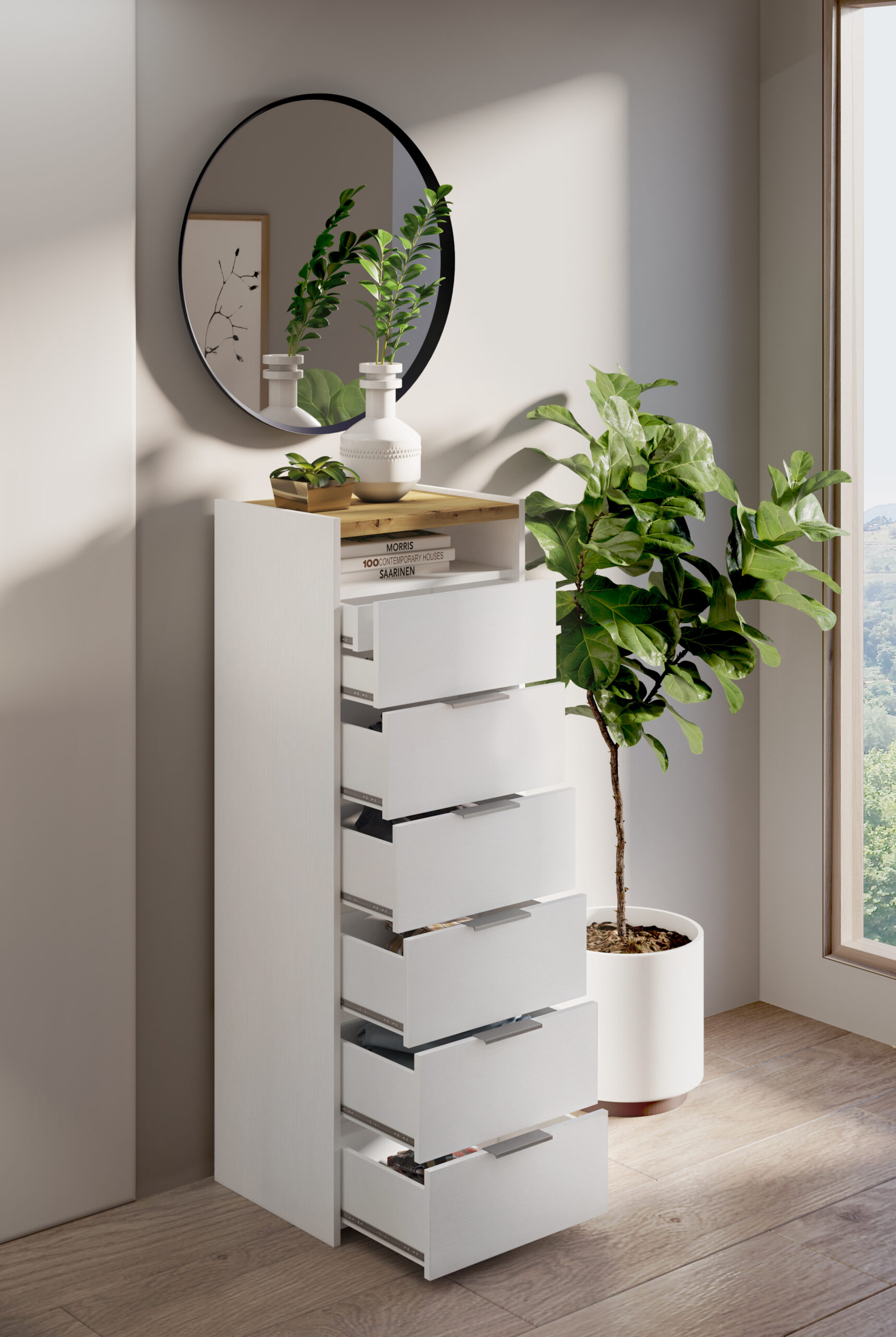 Settimanale con 6 cassetti e un vano giorno in finitura bianco frassino con top in cemento beton o legno artisan.