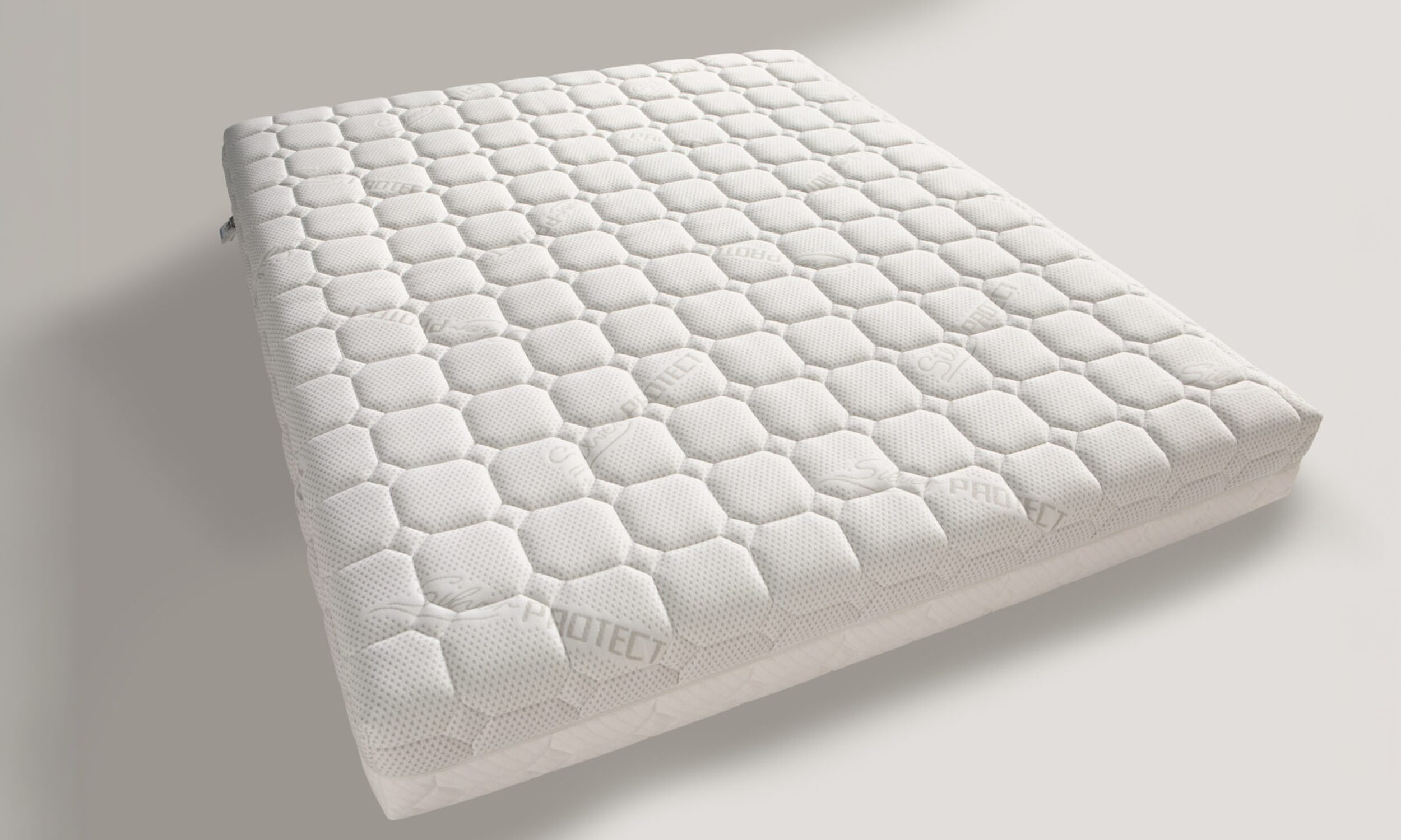 Materasso privo di CFC composto da 2 lastre: Water foam per un sostegno uniforme del corpo e Memory foam termosensibile che coadiuva il sonno.